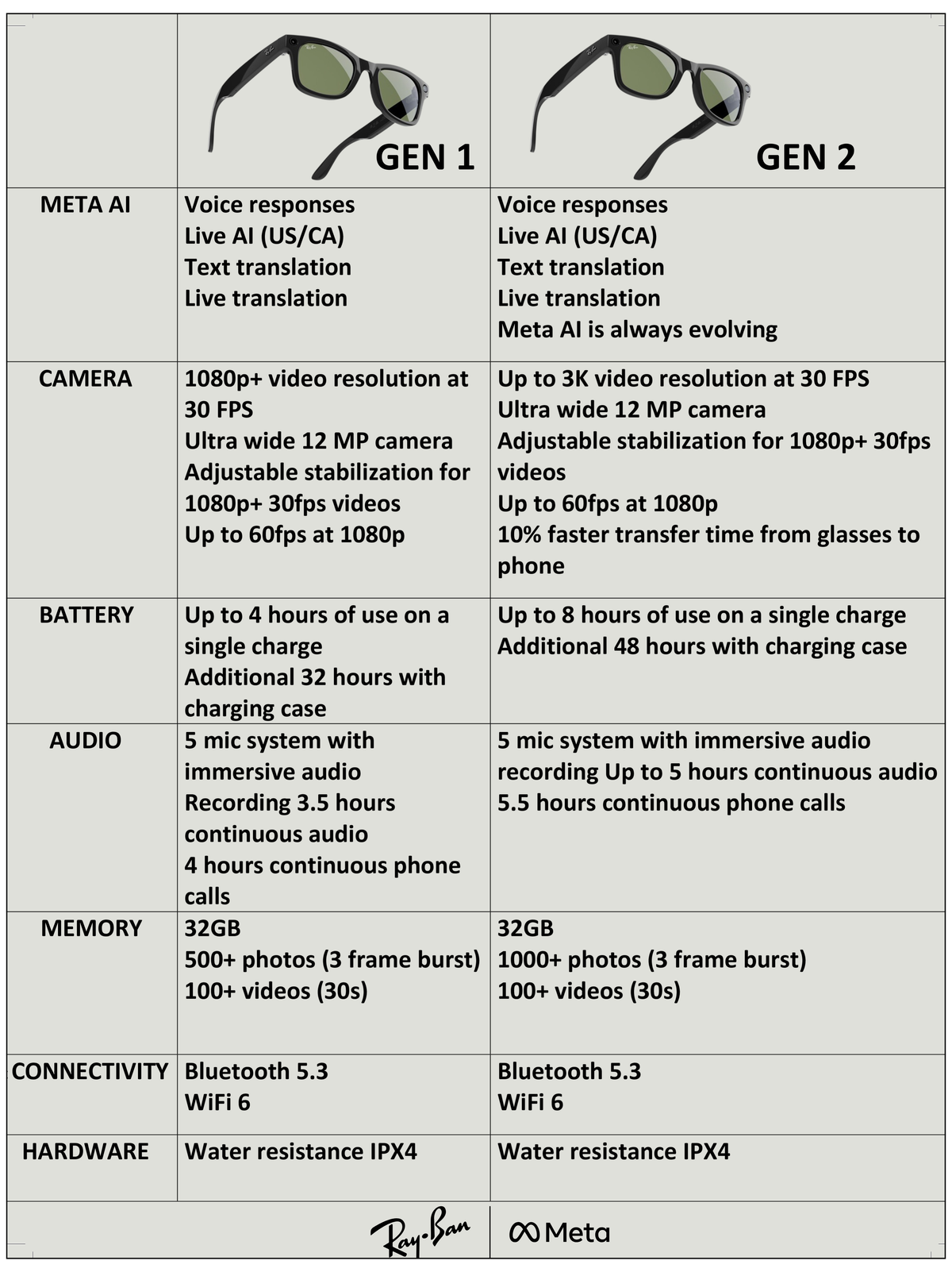 The Clear Lenses For The Ray-Ban Meta (Gen 2) Smart Glasses offer 100% UVA/UVB protection, a blue-violet light filter, and are available as standard clear lenses or light-intelligent Transitions lenses that adapt to different lighting conditions. They include a filter to protect your eyes from blue-violet light emitted by digital screens and the sun.